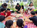 The best part? Watching their pizzas bubble and puff in the blazing wood-fired oven, and taking it out fresh and piping. They will finish off by eating their creation for lunch/dinner during the session. Cordial (e.g. Ribena) included.